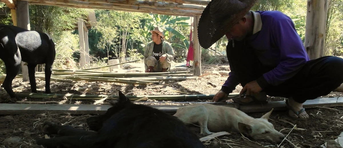 為了建造穩固實用、友善環境、舒適生活的竹屋,在地克倫族夥伴、農場經理 Asawin 特別向父親請教蓋竹屋的方法。從揀選材料、製成建材到建築完工的過程中,夥伴們浸潤在前人的生活經驗中,學習自然與生命間精煉的智慧,將自然資源適性適才地利用,創造出友善環境也舒適宜人的共生空間。