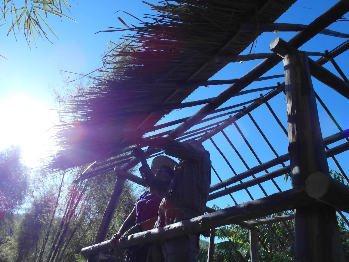 後來,Nelson 妻子藉著利用照顧孩子的閒暇時間,一週內為農場編織了 60 組屋頂草片,作 1 座竹屋搭建所需。
