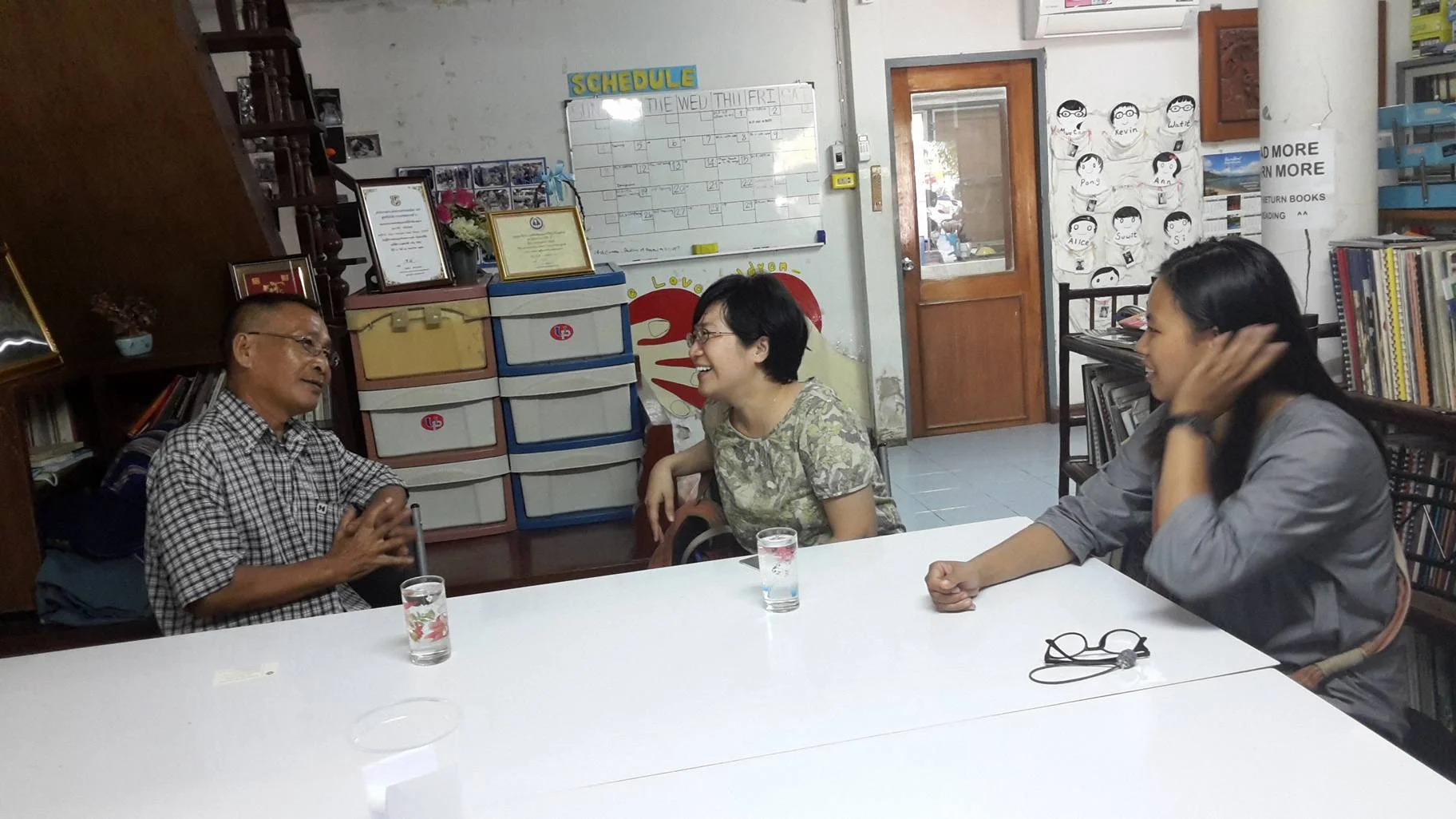左起:邊境的重要夥伴、克倫族老朋友、TBCAF 基金會執行長 Pi Watit,以萱老師,還有實習生元瑜。